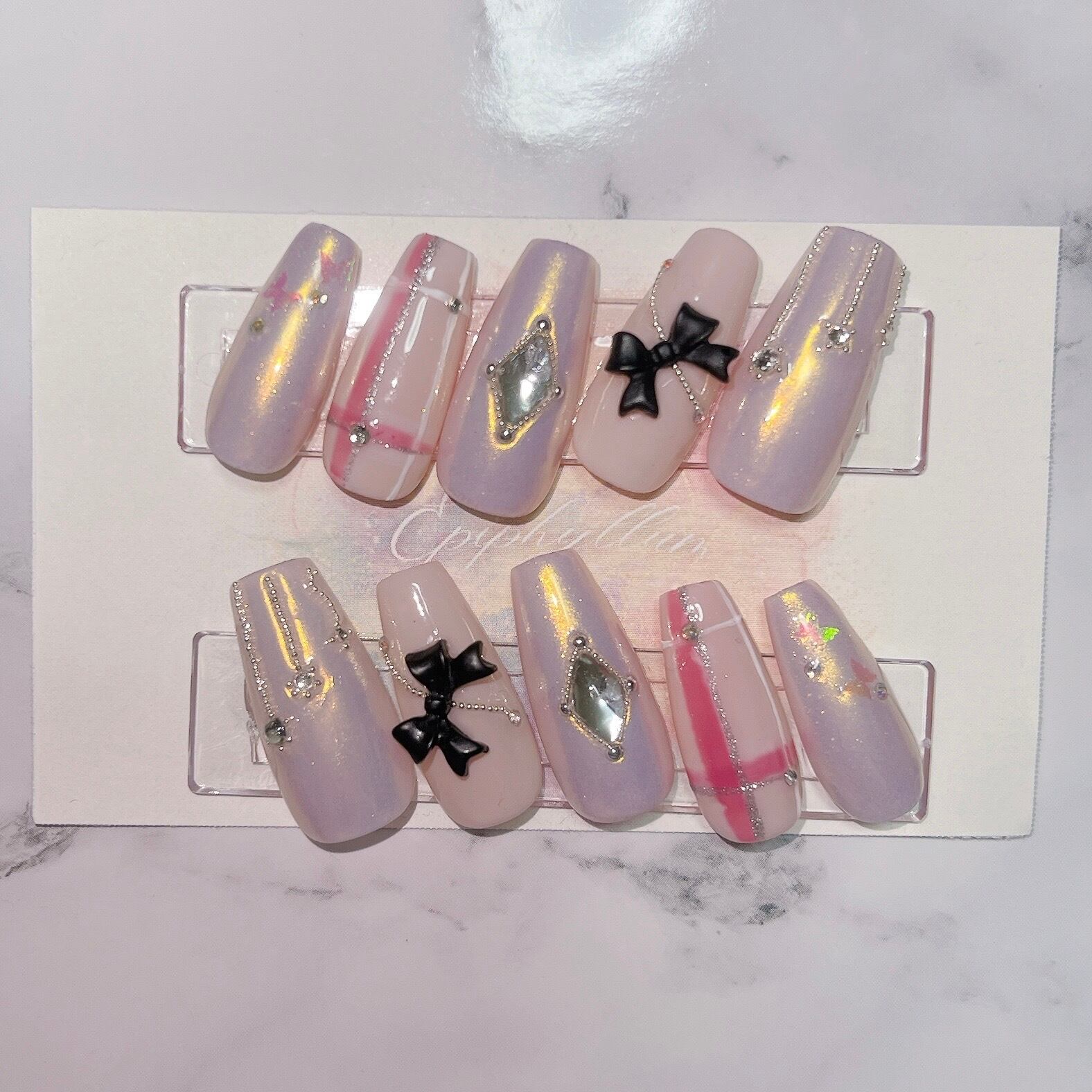 このネイルは、1つずつブリオンで手作りされた手書きのチェックデザインが特徴です。ピンクの色合いが美しく、光を受けることでオーロラのような輝きを放ち、指先に華やかさを添えます。シンプルでありながらも、他にはない個性的な印象を与えるアイテムですので、その魅力をぜひ体感してください!
