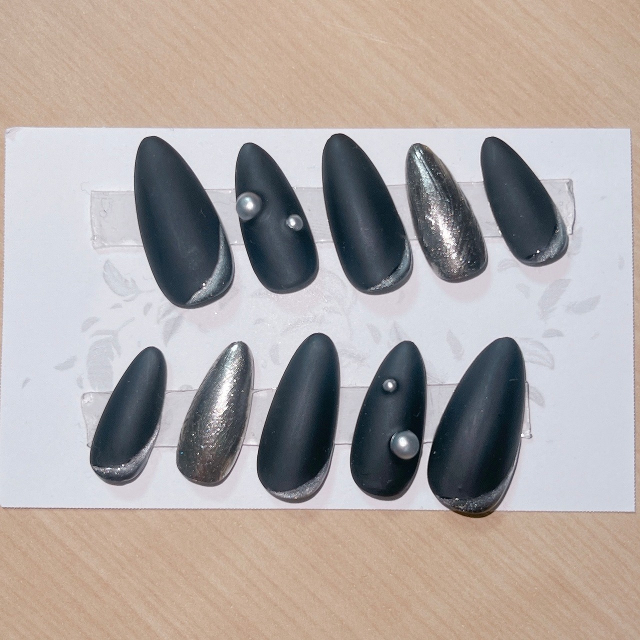 このネイルは、ブラックマットのベースにシルバーミラーのモヤモヤが加わったデザインが特徴で、シンプルながらも洗練された印象を与えます。繊細なラインで仕上げられたマグは、さりげなく存在感を放ち、指先を美しく演出します。デイリーユースから特別なシーンまで、幅広くお楽しみいただけるアイテムですので、その魅力をぜひ体感してください!